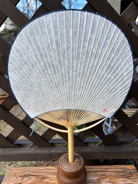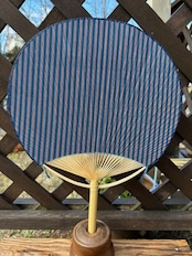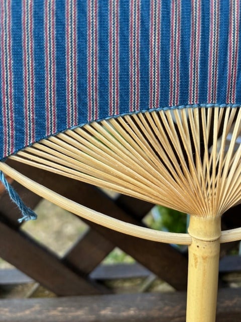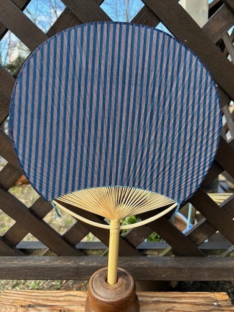 千葉県無形文化財の第3代齊藤頴(ひで)氏の唐棧織(縞柄名:浅葱地西川)をうちわに貼りました。