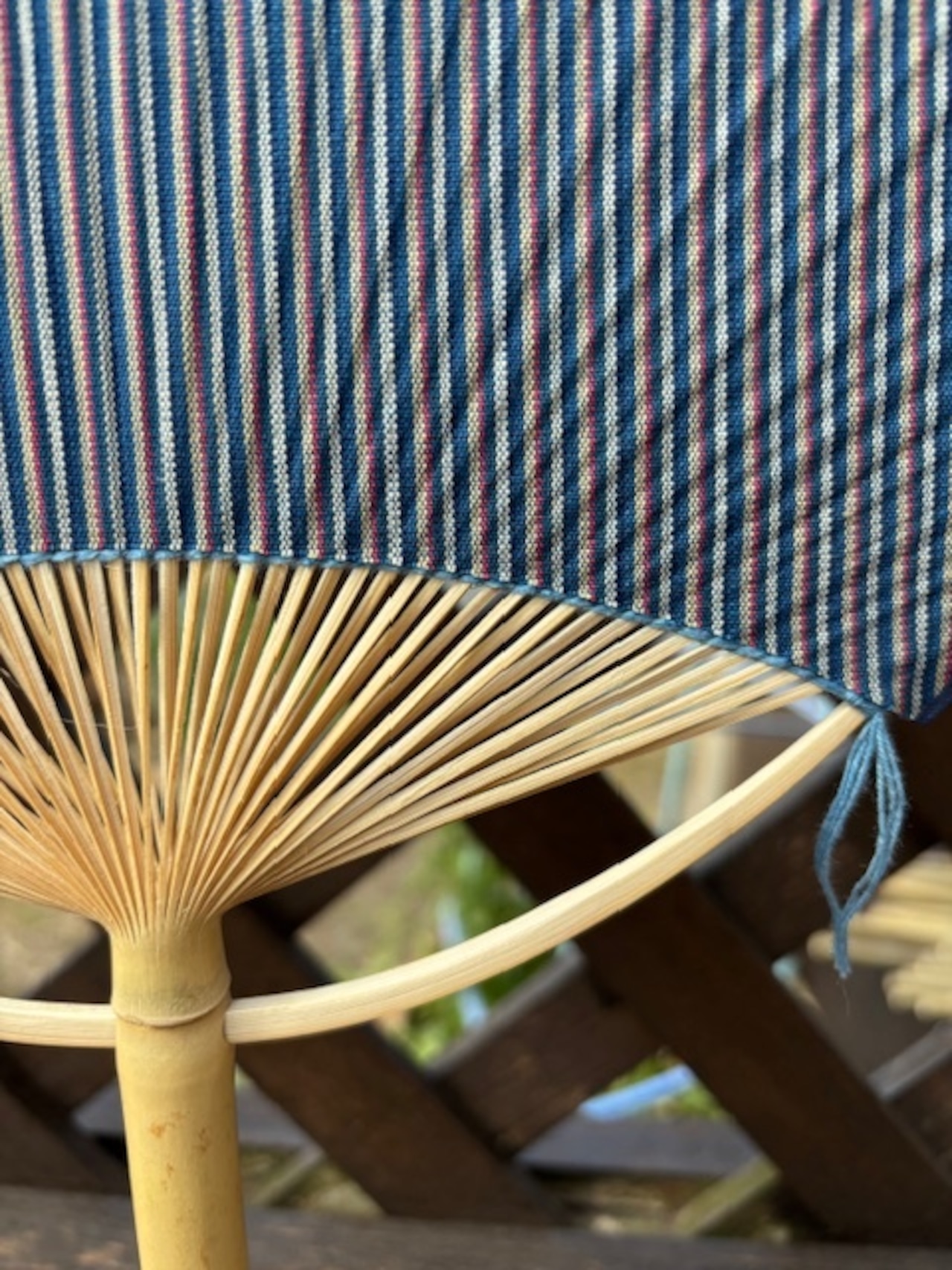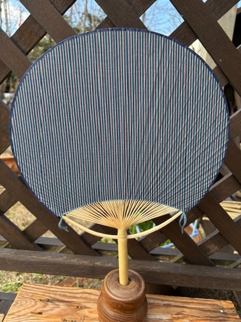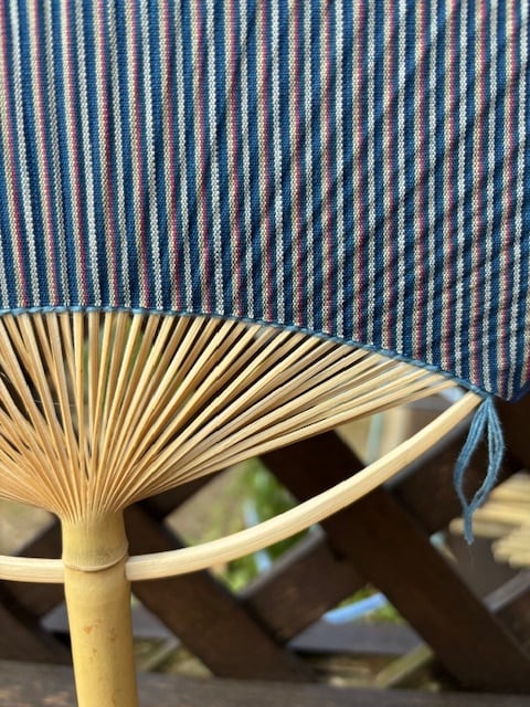 千葉県無形文化財の第3代齊藤頴(ひで)氏の唐棧織(縞柄名:清元)をうちわに貼りました。