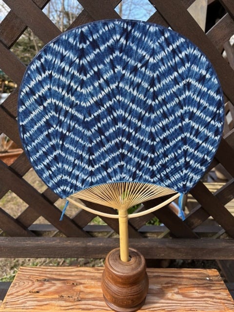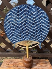 絞り染めの綿布を貼りました。うちわの柄は、生地から貼り素材を切り取る場所により、写真と多少異なることがあります。