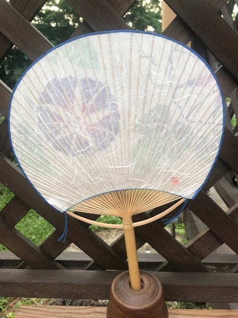 うちわには朝顔柄の浴衣地を貼りました。