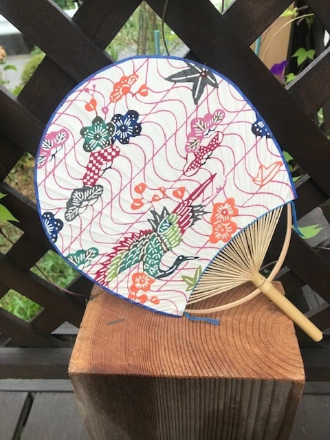 うちわには、型染和紙を貼りました。うちわの柄は、生地から貼り素材を切り取る場所により、写真と多少異なることがあります。